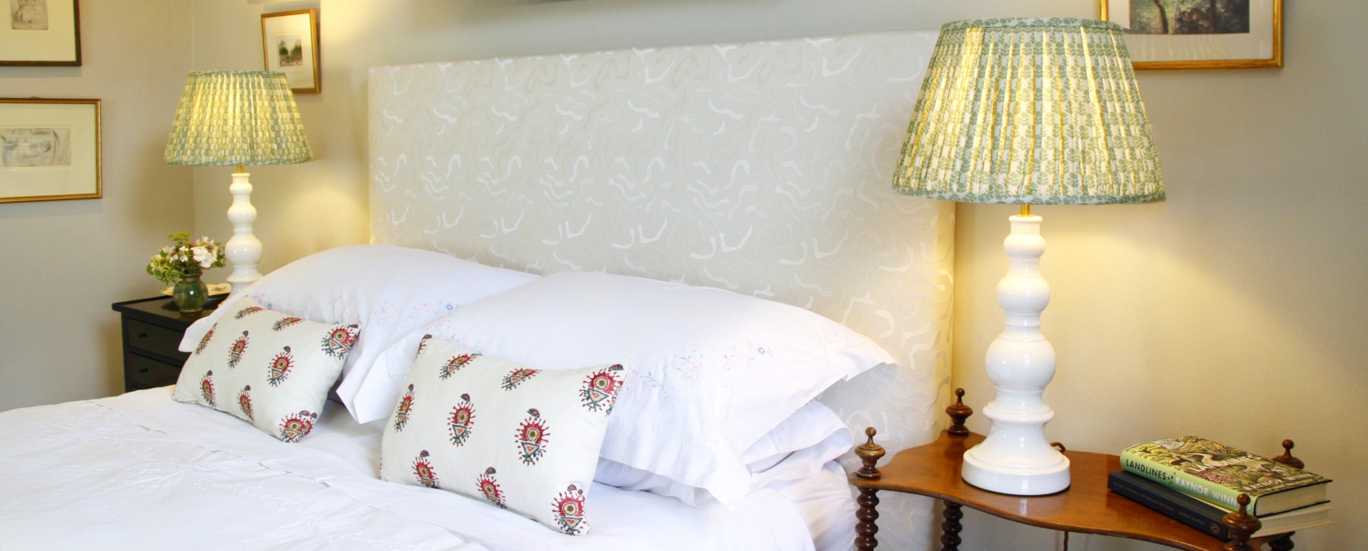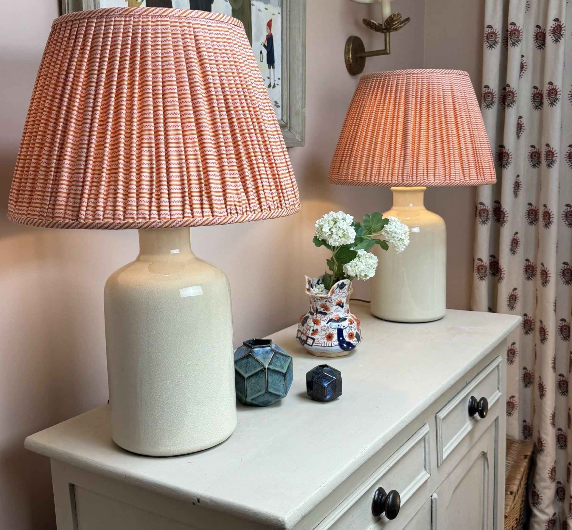 Haslam West Lampshades are all made in the UK by the very best skilled Lampshade makers. We have a range of Chalk White Linen Gathered, China White Card or pretty patterned fabrics. We can also make in your own material. Shown here is our creamware candlestick with an Irish linen gathered lampshade.